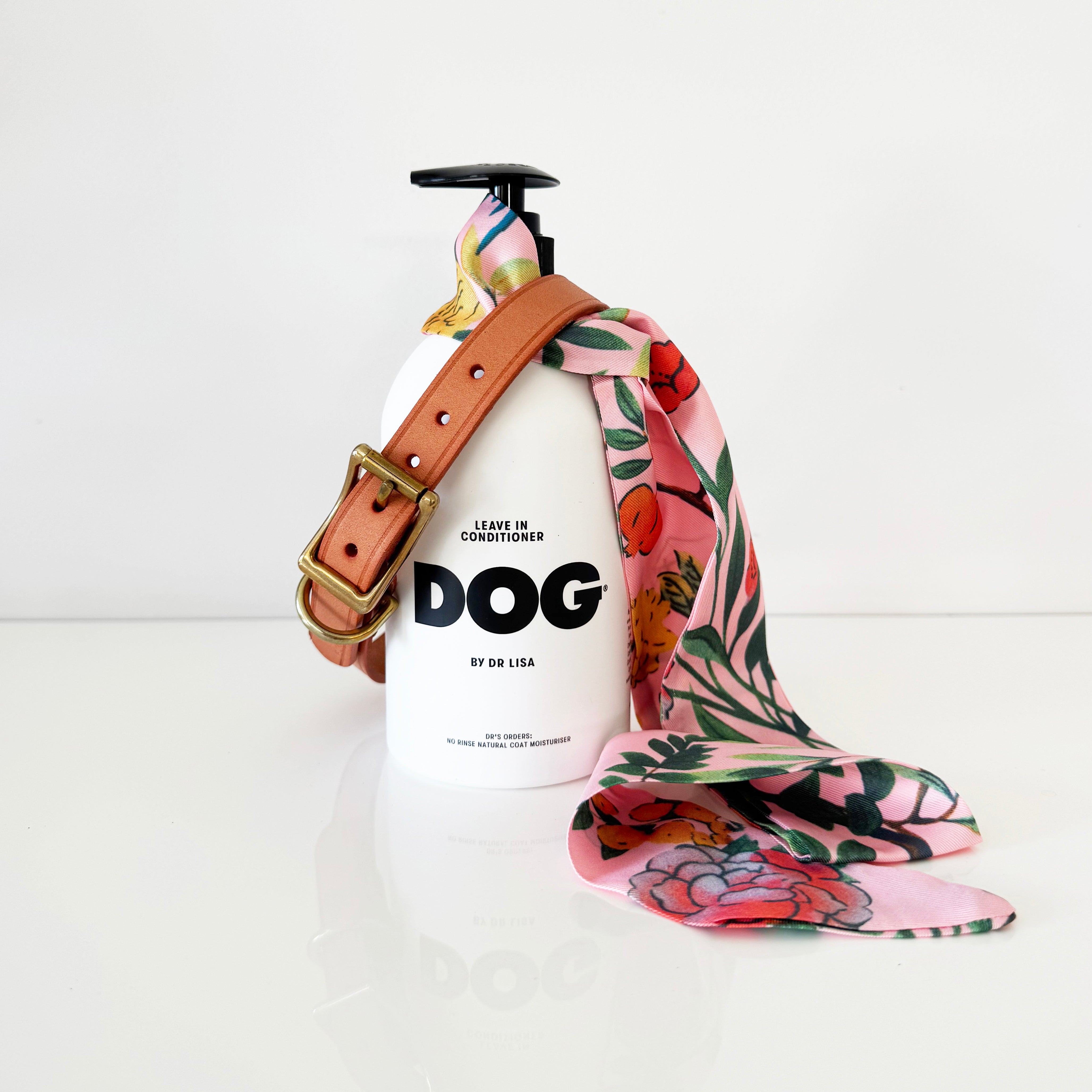This luxe gift bundle includes DOG by Dr Lisa Leave-In Conditioner, a leather collar (choose Medium or Large), and one of our beautiful printed scarves, select your favourite from our range and make a note at checkout.