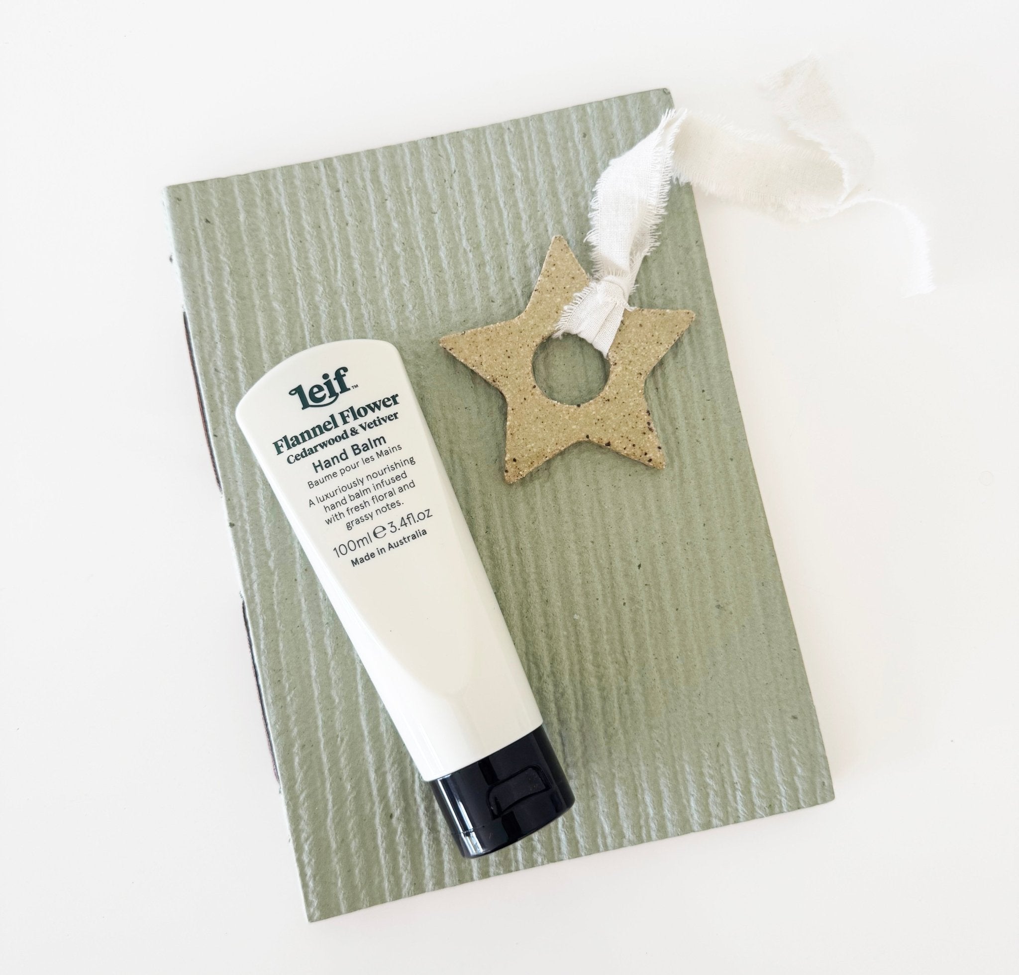 This curated bundle includes Leif’s luxurious Flannel Flower Hand Balm, a handmade ceramic star ornament, and a beautiful Saraswati journal for notes, reflections, or new ideas.