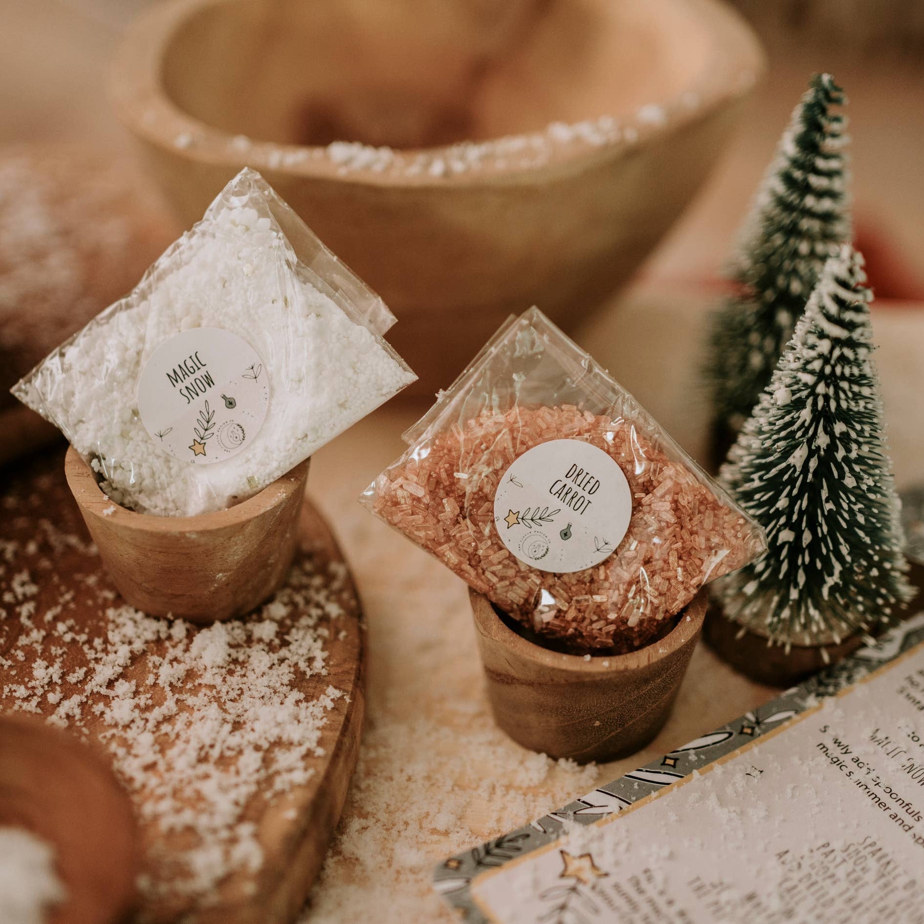 Sprinkle the dry ingredients into a bowl or onto the ground. Add water slowly and watch the potion fizz, sparkle and shimmer. Complete the Christmas Wishes reflection card together and read the Call the Reindeer spell aloud to guide Santa and his sleigh.